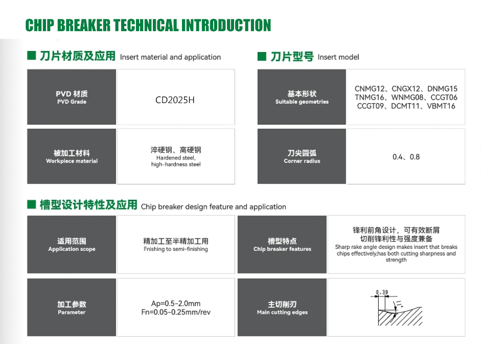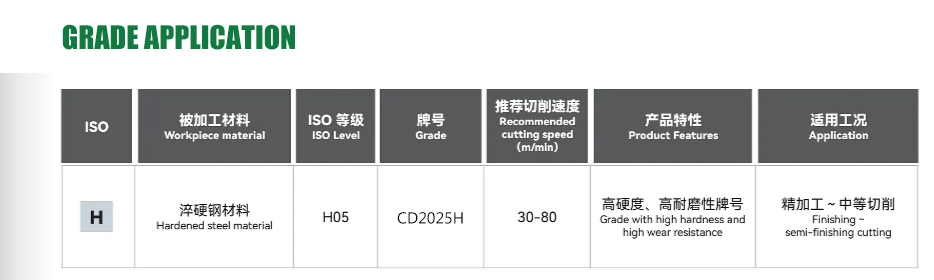 የ CD2025hr ተከታታይ ማስገባቶች, የላቀ የመኖሪያ ቴክኖሎቻቸውን, ከፍተኛ ጥንካሬን, እና የተመቻቸ የቺፕ ሪፈርስ ንድፍ, ለከባድ ብረት ማሽን አስተማማኝ መፍትሄ ያቅርቡ. ለትክክለኛው ምርጫ የሙከራ መቁረጥ ለተመቻቸ ኢኮኖሚያዊ ውጤታማነት በተወሰኑ የማካሪያ ውጤቶች ላይ የተመሠረተ ልኬቶችን ለማስተካከል ይመከራል.