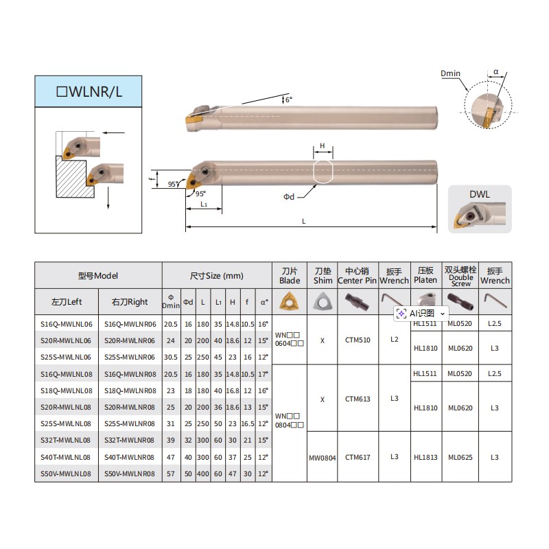 The S20R-MWLNR/L08 is a heavy-duty internal boring bar featuring a robust M-type (Top Clamp) clamping mechanism. Designed to hold WNMG0804 (Trigon) inserts, it offers maximum stability for internal turning and profiling. With a 20mm shank diameter and a total length of 200mm, this tool is built for rigidity and precision in medium-to-large bore machining.